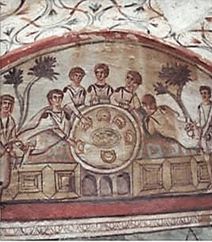 For formal meals, Romans reclined on couches to eat, using their right hand to take food and leaning on their left arm. In the 4th century, reclining on a semicircular couch was the fashion, so sometimes a semicircular apse was built into a wall for the couch.