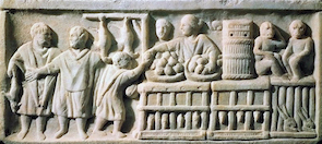 Sculptures on Roman tombs, and rich, elaborate coffins displayed inside tomb buildings, sometimes show scenes of the dead person’s life. I found sculptures of a woman keeping a shop, men and women eating dinner, and a child holding a pet.